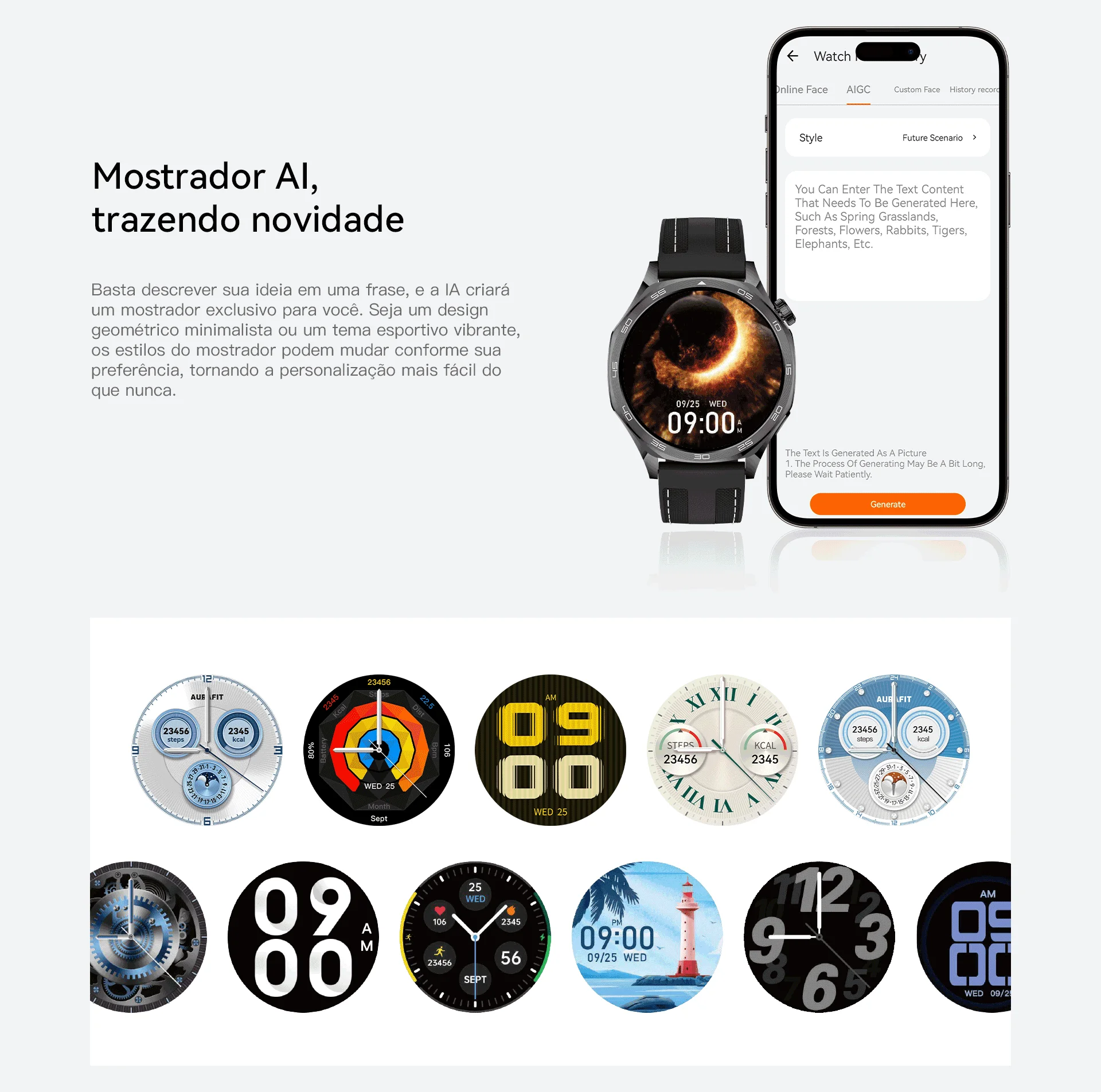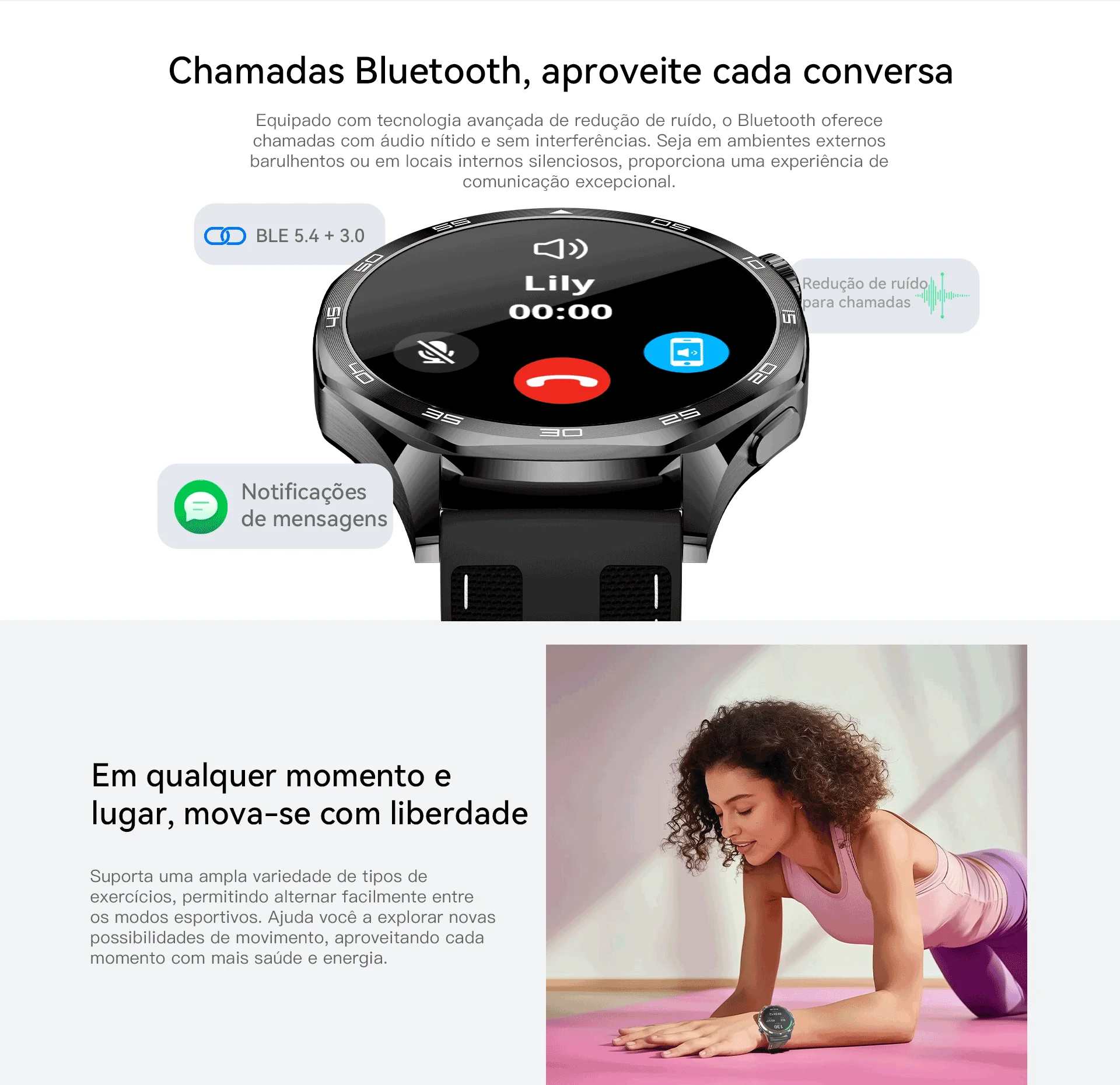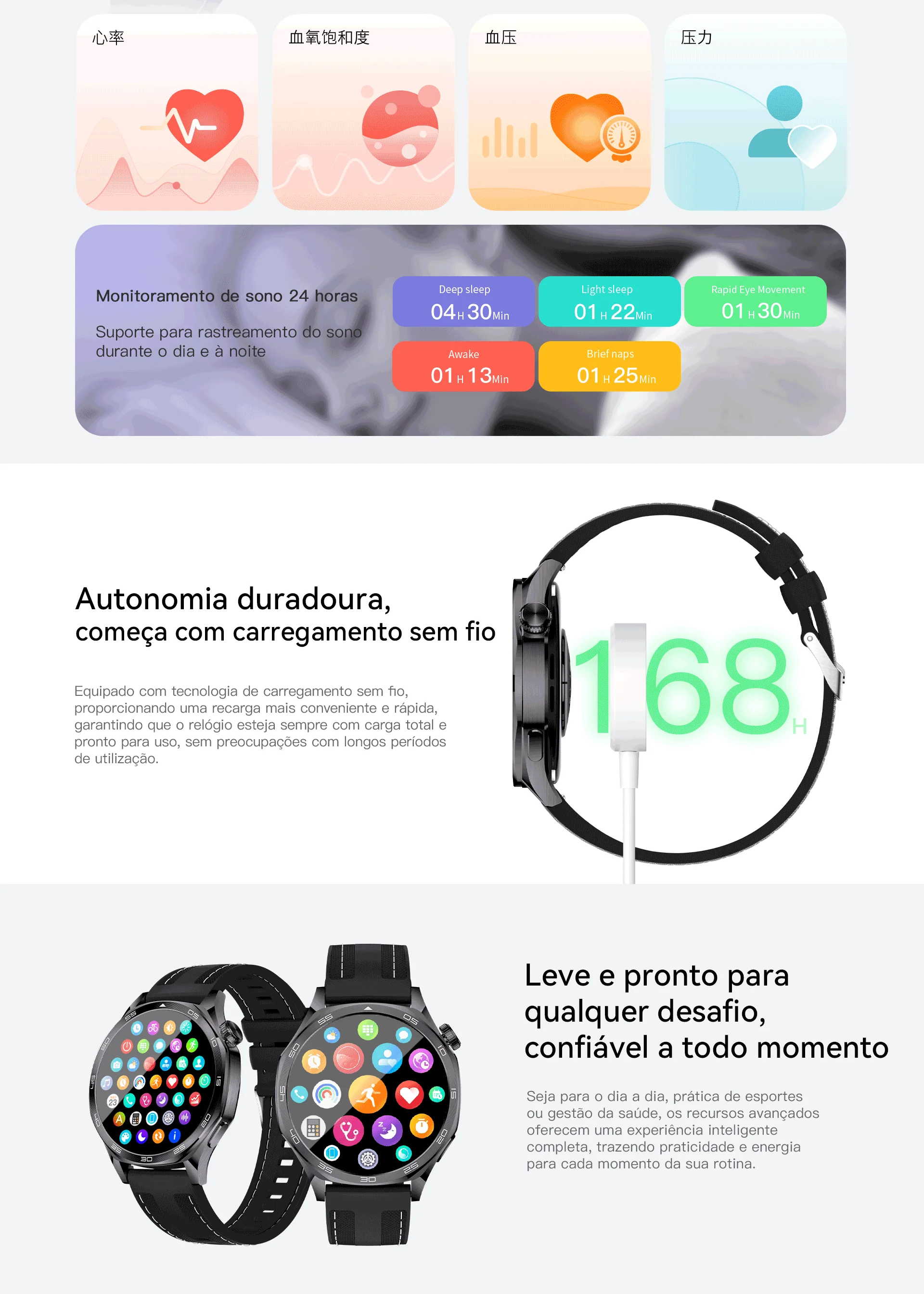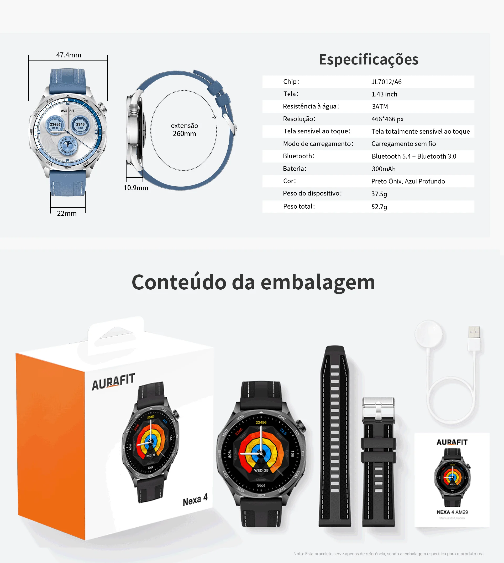 Tela:Tela AMOLED vibrante de 1.43 polegadas com alta resolução de 466x466 pixels e brilho de 450 cd/m2, garantindo excelente clareza mesmo sob luz solar.