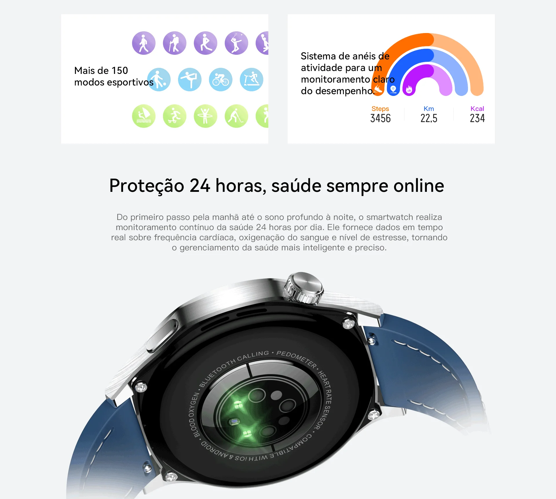 Modos Esportivos:Suporta uma ampla gama de atividades, incluindo caminhada, corrida (interna/externa), ciclismo, caminhada, ioga, basquete, futebol e badminton.O aplicativo dedicado pode estender o suporte de mais de 100 modos esportivos.
